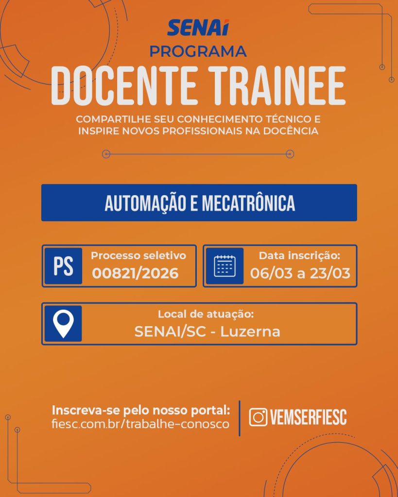 ✅ 00821/2026 – 𝐃𝐨𝐜𝐞𝐧𝐭𝐞 𝐓𝐫𝐚𝐢𝐧𝐞𝐞 𝐜𝐨𝐦 𝐚𝐭𝐮𝐚𝐜̧𝐚̃𝐨 𝐞𝐦 𝐀𝐮𝐭𝐨𝐦𝐚𝐜̧𝐚̃𝐨 𝐞 𝐌𝐞𝐜𝐚𝐭𝐫𝐨̂𝐧𝐢𝐜𝐚 (SENAI Luzerna – SC)