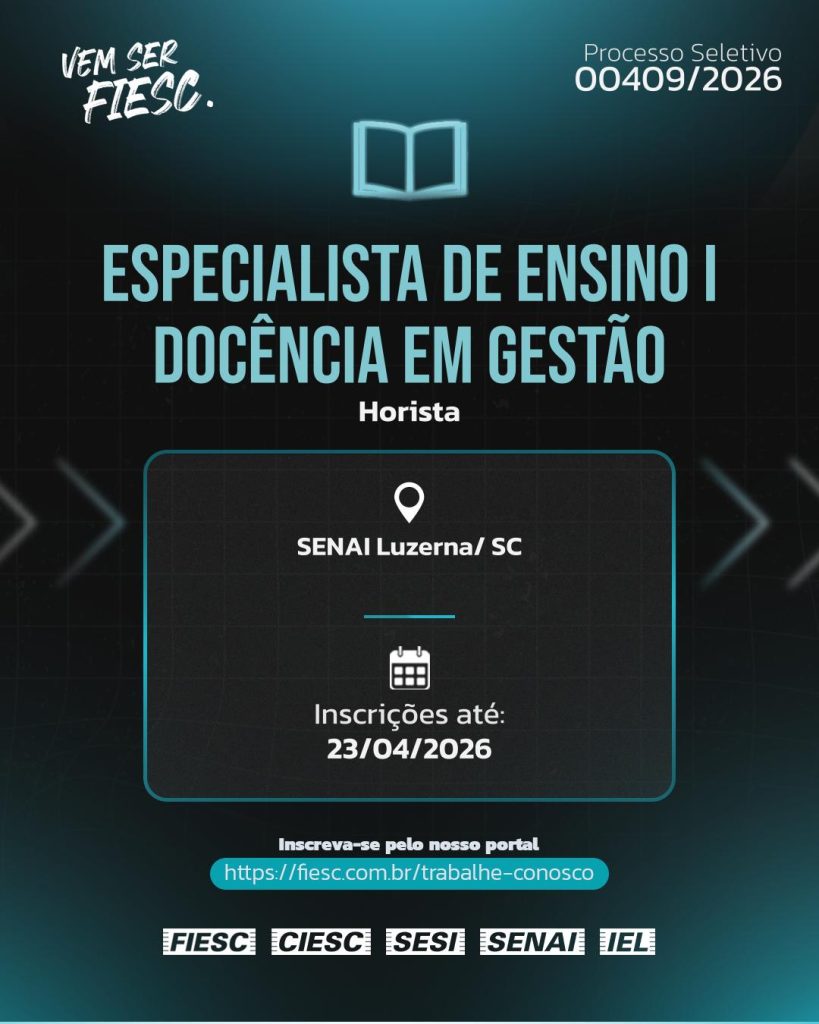 Inscrições pelo link: https://fiesc.pandape.infojobs.com.br/Detail?id=2982185