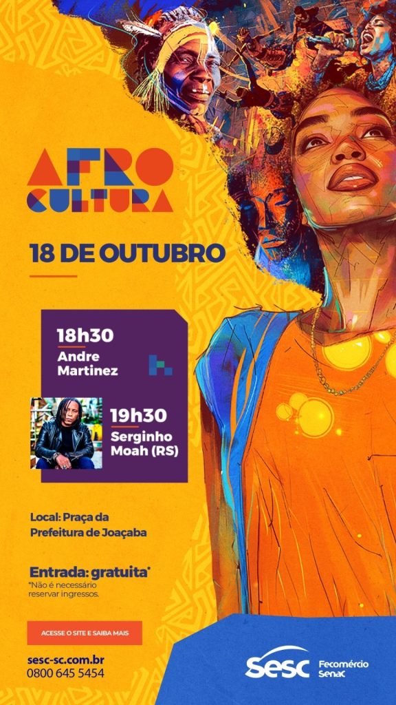 Uma grande festa de celebração à cultura e à música afro-brasileira está marcada para este sábado, dia 18 de outubro, em Joaçaba. O projeto Afrocultura, realizado pelo Sesc Santa Catarina, desembarca na cidade com a sua Caravana Afrocultura, trazendo o show nacional gratuito de Serginho Moah, o carismático ex-vocalista da banda Papas da Língua.