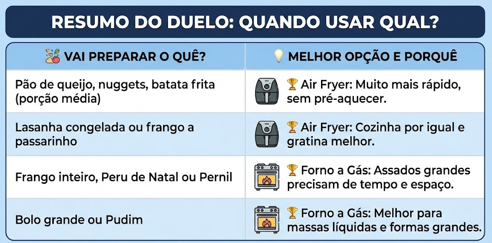 Se no verão a briga é pelo clima (Ar x Ventilador), na cozinha o duelo é diário. De um lado, o tradicional forno a gás, presente na maioria dos lares do Meio-Oeste. Do outro, a queridinha do momento: a Air Fryer (fritadeira elétrica), que promete rapidez e crocância.