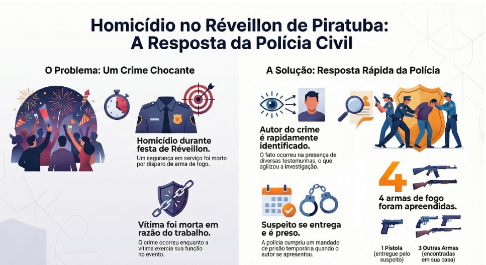 O crime teve como vítima um segurança que trabalhava no evento de Réveillon e foi atingido por disparo de arma de fogo enquanto exercia sua função. Apesar de ter sido socorrido, ele não resistiu aos ferimentos. Desde as primeiras horas após o ocorrido, a Polícia Civil instaurou inquérito policial para apurar todas as circunstâncias do homicídio.