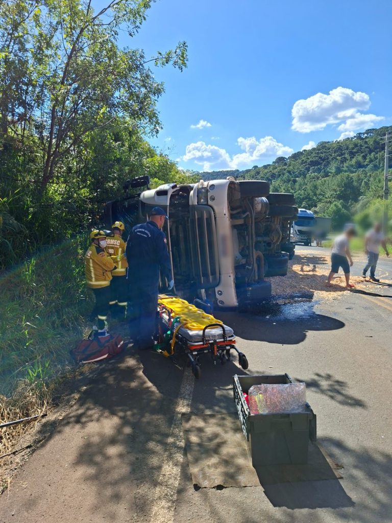 Caminhão tomba na SC-135 em Rio das Antas e motorista é levado ao hospital