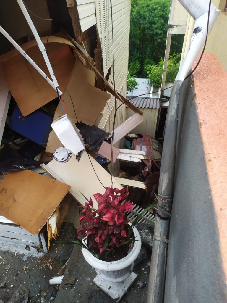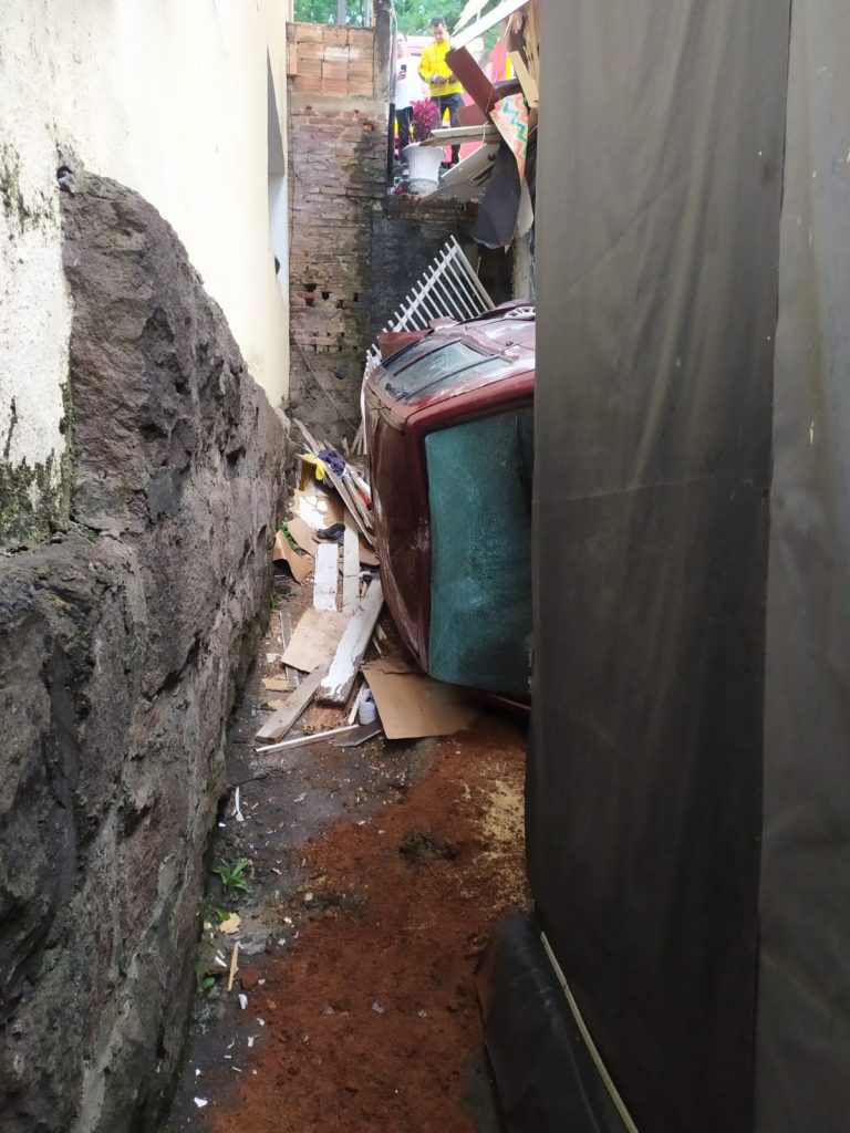 Fiat Uno caiu em nível inferior de imóvel na Rua Frei Rogério; moradores dormiam no local e não se feriram