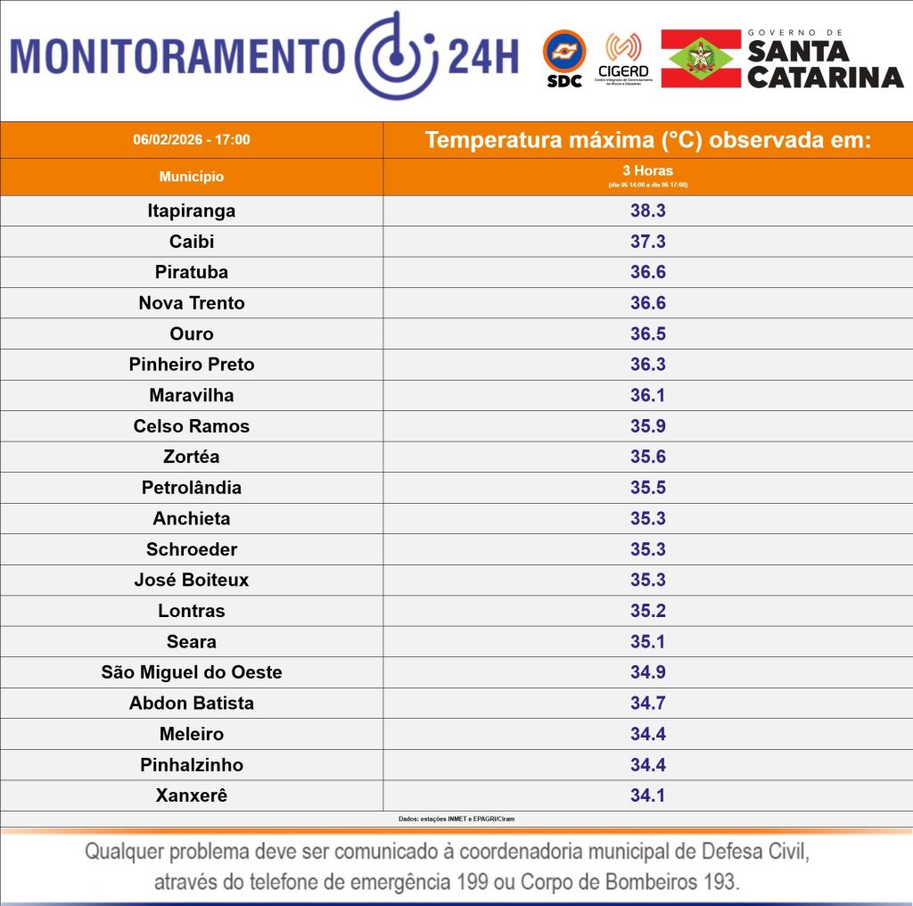 Piratuba, por exemplo, marcou quase 40ºC nesta tarde, conforme dados da Defesa Civil de Santa Catarina.