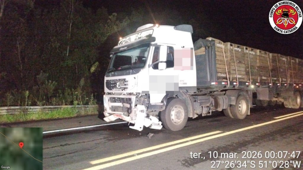 No local, foi constatada uma colisão traseira seguida de saída de pista, envolvendo um caminhão Volvo FH 370, de cor branca, e uma caminhonete Rampage, de cor preta. O caminhão era conduzido por um homem de 48 anos, que não sofreu ferimentos e permaneceu no local do acidente.