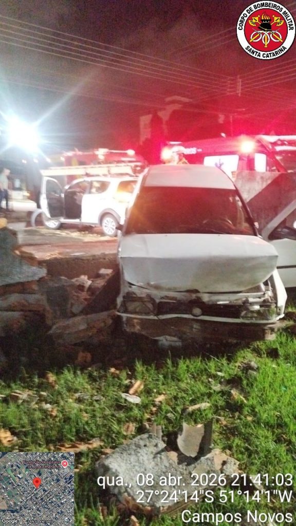 Um acidente de trânsito foi registrado na noite desta terça-feira (8), por volta das 21h28, no bairro Santo Antônio, em Campos Novos. De acordo com o Corpo de Bombeiros Militar, a ocorrência foi atendida no cruzamento das ruas Nereu Ramos e Silvio Neves Bleyer, onde houve uma colisão frontal entre dois veículos.
