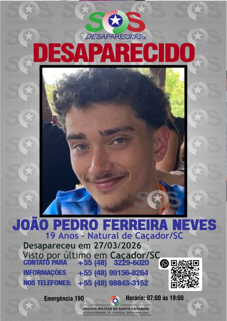 Segundo o Caçador Online, a vítima foi identificada como João Pedro Ferreira Neves, jovem que estava desaparecido desde o dia 27 de março. O corpo foi localizado em avançado estado de decomposição. Além da Polícia Militar, também foram acionadas equipes da Polícia Civil , da Polícia Científica e dos Bombeiros Voluntários de Caçador.
