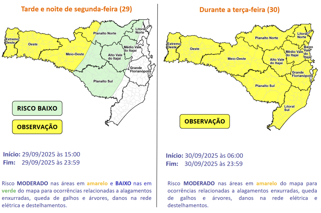 Essa condição tende a ficar restrita ao Grande Oeste e parte do Planalto Norte, começando pelas áreas de divisa com o Paraná e se estendendo para o restante das regiões. O risco é baixo a moderado para ocorrências associadas a destelhamentos, danos na rede elétrica, queda de galhos e árvores e danos na rede elétrica, alagamentos e enxurradas pontuais.