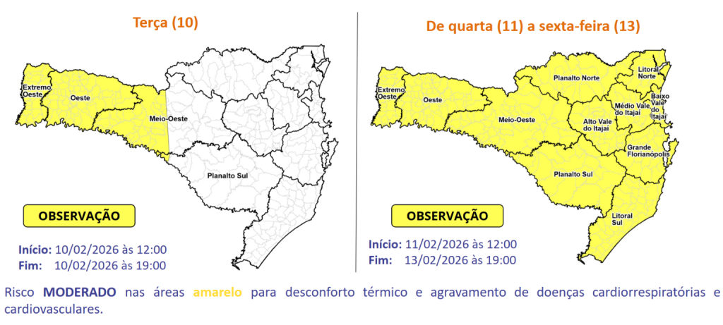 A tendência para os próximos dias indica intensificação do calor. Entre quarta-feira (11) e sexta-feira (13), as temperaturas sobem ainda mais em todo o estado. No Grande Oeste e no Litoral Sul, as máximas devem variar entre 34°C e 37°C, enquanto nas demais regiões os termômetros ultrapassam facilmente os 30°C. Com isso, o risco relacionado ao calor intenso passa a ser elevado em grande parte de Santa Catarina.