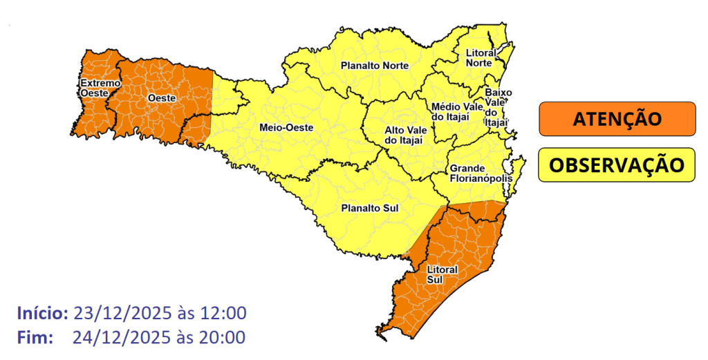Conforme o alerta do órgão, no período aumentam as condições para temporais com chuva intensa em Santa Catarina. O risco é moderado a alto para ocorrências associadas a alagamentos, enxurradas pontuais, destelhamentos, danos na rede elétrica e queda de galhos e árvores.