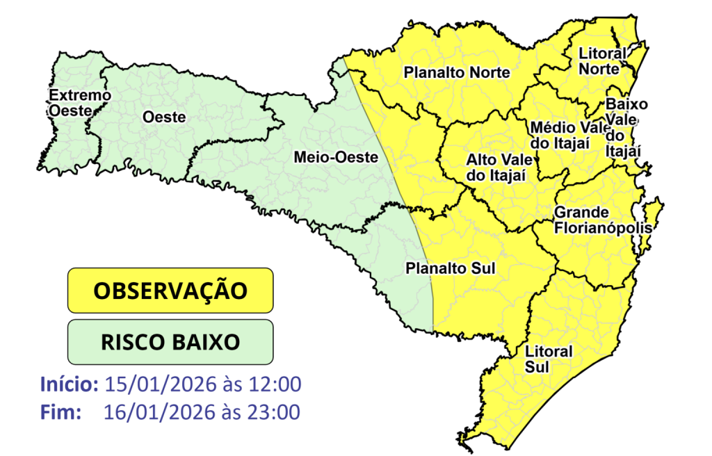 Portanto, o risco é moderado entre o Meio-Oeste e o Litoral de Santa Catarina para ocorrências como alagamentos, destelhamentos, danos na rede elétrica e queda de galhos e árvores. Nas demais áreas, o risco é baixo. A Defesa Civil reforça a importância em acompanhar as atualizações e alertas emitidos nos próximos dias nos nossos canais oficiais.