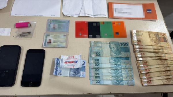 Durante a abordagem, os policiais apreenderam diversos comprovantes bancários, cerca de R$ 2,1 mil em dinheiro, cartões de crédito, três celulares e uma pequena quantidade de maconha. Todo o material foi recolhido, e os dois homens foram encaminhados à Delegacia de Polícia Civil, onde o caso segue sob investigação.