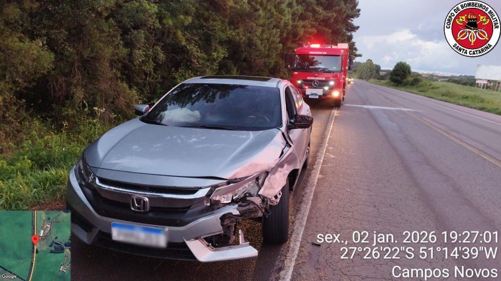 Um acidente de trânsito envolvendo dois veículos foi atendido pelo Corpo de Bombeiros Militar na noite desta sexta-feira (2), por volta das 19h00, na BR-470, nas proximidades do trevo do Ibicuí, em Campos Novos. A colisão entre os automóveis resultou no capotamento de um deles.