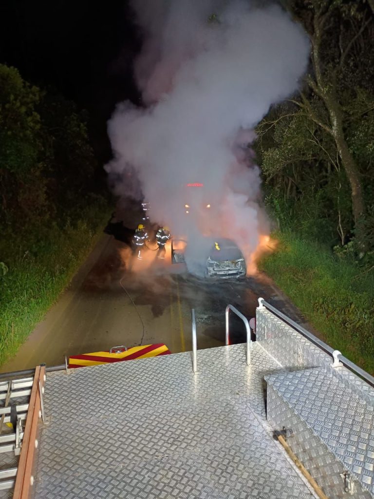 Duas guarnições foram acionadas pela Central de Emergências e, ao chegarem ao local, confirmaram que um Volkswagen Golf, de cor prata e com placas de Fraiburgo, estava completamente tomado pelas chamas, com incêndio em desenvolvimento total, atingindo toda a estrutura do automóvel.