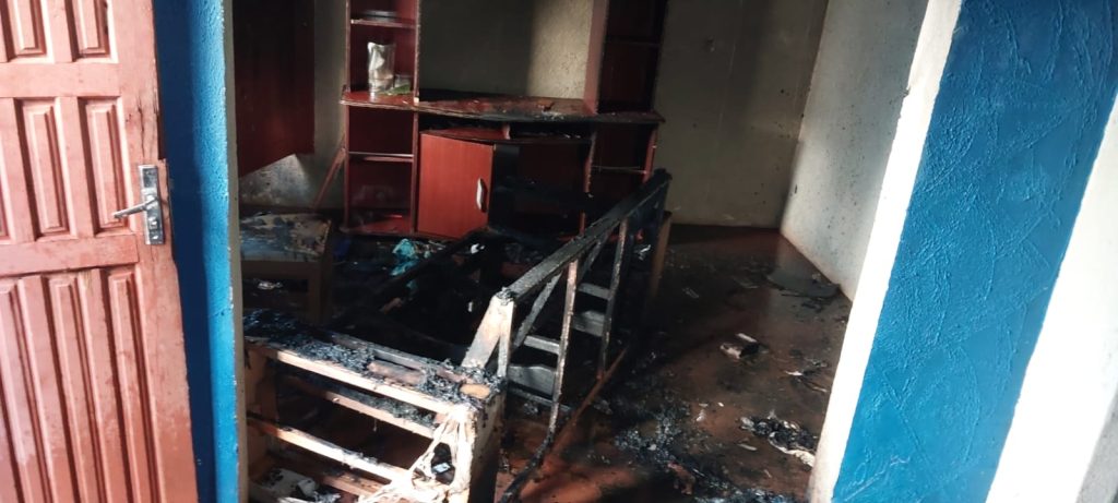 No local, a equipe confirmou a ocorrência em um imóvel de dois pavimentos, construído em madeira, com cerca de 200 metros quadrados. Conforme relato de uma mulher de 45 anos, que ocupava irregularmente a casa junto com o companheiro, de 33 anos, e outras três pessoas, o incêndio teria sido iniciado de forma intencional por um dos ocupantes, em uma sala no pavimento inferior.