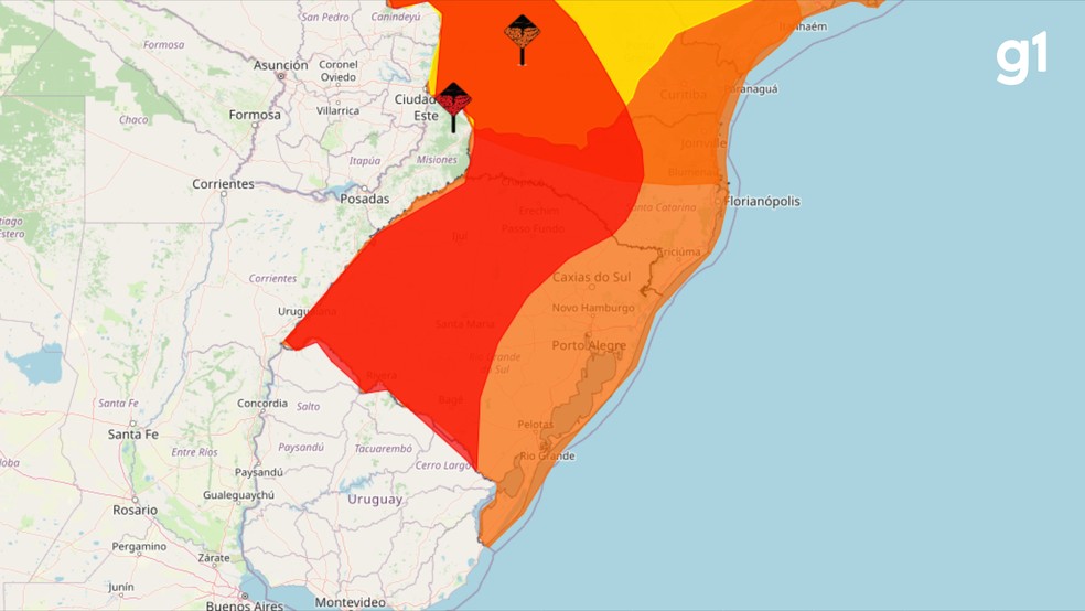 Além disso, o litoral de SC, RS e PR está sob alerta laranja para ventos costeiros, entre a meia-noite de domingo e 18h de segunda. Nas áreas litorâneas, os ventos devem se intensificar a ponto de movimentar dunas de areia e causar transtornos nas regiões de orla.