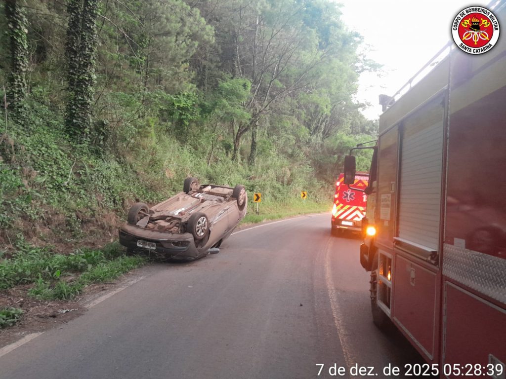 O veículo, um Chevrolet Prisma cinza com placas de Abelardo Luz, havia saído da pista e capotado. O motorista, um jovem de 18 anos, já estava fora do automóvel quando os bombeiros chegaram. Ele se encontrava consciente, orientado e caminhando pelo local, apresentando apenas queixa de náuseas e tontura.