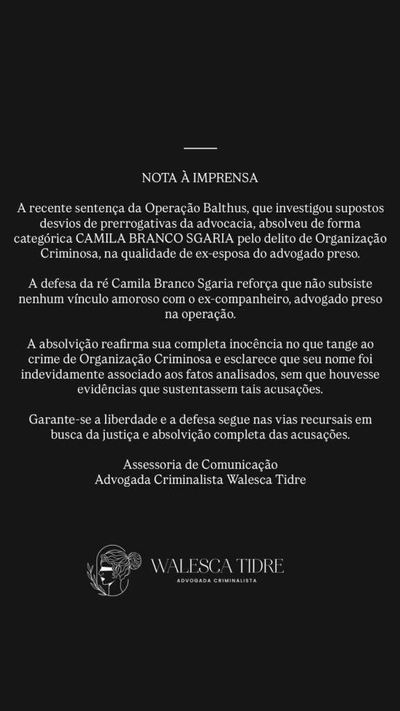 Outro ponto destacado no comunicado é a situação civil da absolvida. A nota esclarece que Camila Branco Sgaria não possui mais nenhum vínculo amoroso ou relacionamento com o ex-companheiro, o advogado Alexandre Hilário Prazeres, que também foi alvo da operação e acabou condenado no processo.