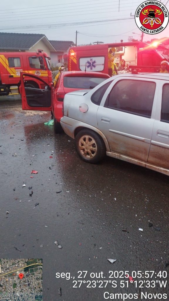 O Corpo de Bombeiros Militar atendeu, por volta das 5h40 desta segunda-feira, dia 27, uma colisão entre dois veículos na Rua Santo Amaro da Imperatriz, no Bairro Nossa Senhora Aparecida, em Campos Novos. De acordo com as informações, o acidente envolveu um Volkswagen Gol, conduzido por um homem de 26 anos, e um Chevrolet Corsa.