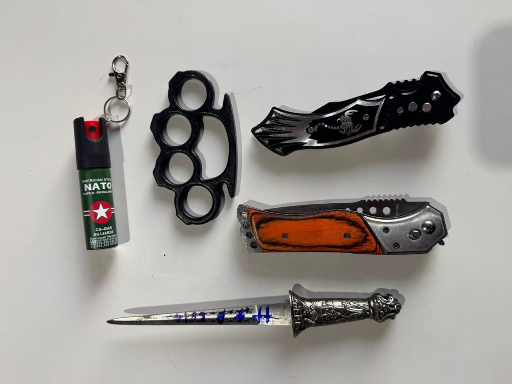Durante o cumprimento dos mandados, os policiais apreenderam dispositivos eletrônicos, armas brancas — como canivetes, punhal e soco inglês —, além de substâncias com potencial de serem utilizadas na produção de explosivos e materiais com simbologia nazista.