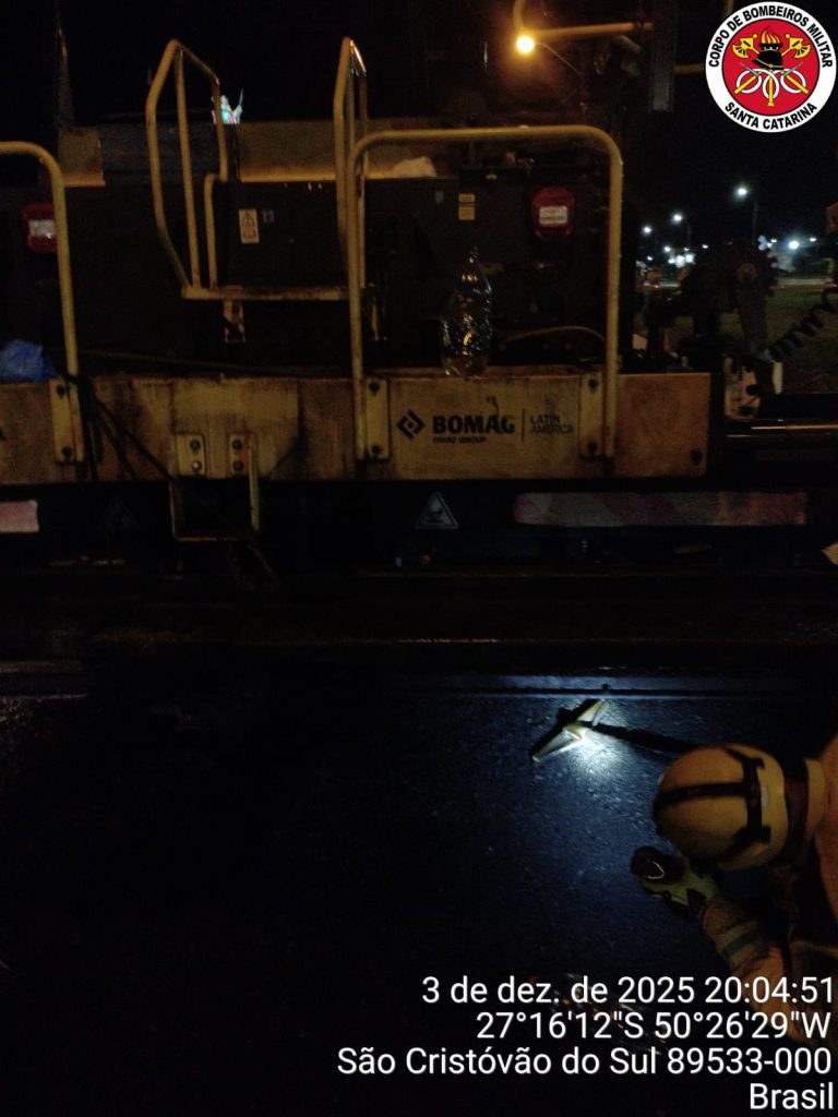 Ao chegar ao local, os bombeiros encontraram o operador de uma máquina vibroacabadora de asfalto, pertencente à empresa Consbrita, já sem vida. O trabalhador estava preso no sistema de esteira e caracol da máquina, apresentando politraumatismos e amputações nos membros inferiores. Ele foi localizado no interior do equipamento, sem sinais vitais.