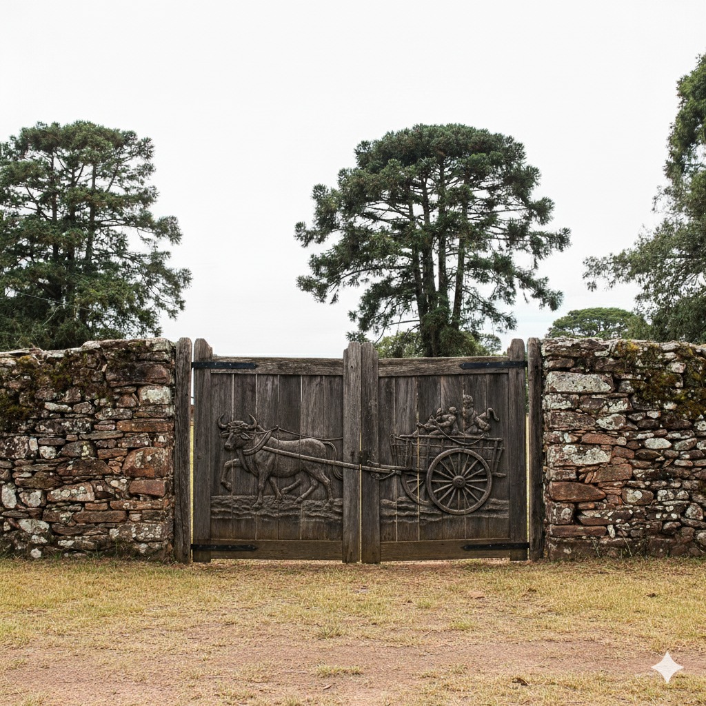 Uma taipa de pedra, bastante antiga, rodeava a frente da propriedade, ostentando um grande portão de madeira de araucária, com o desenho de uma carroça e dois bois entalhados. Na parte interna, ladeando o portão, dois grandes pés de roseira – um vermelho e outro branco – ornamentavam o início da trilha que levava à casa do patrão.