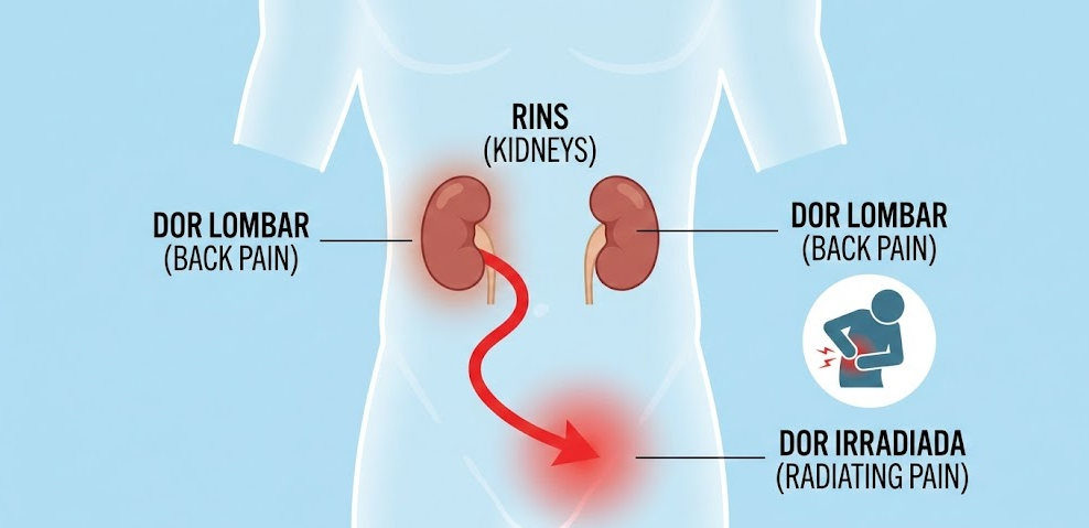 • Dor intensa: Geralmente começa nas costas (região lombar) e irradia para a frente do abdômen ou virilha. A dor não melhora com mudança de posição.