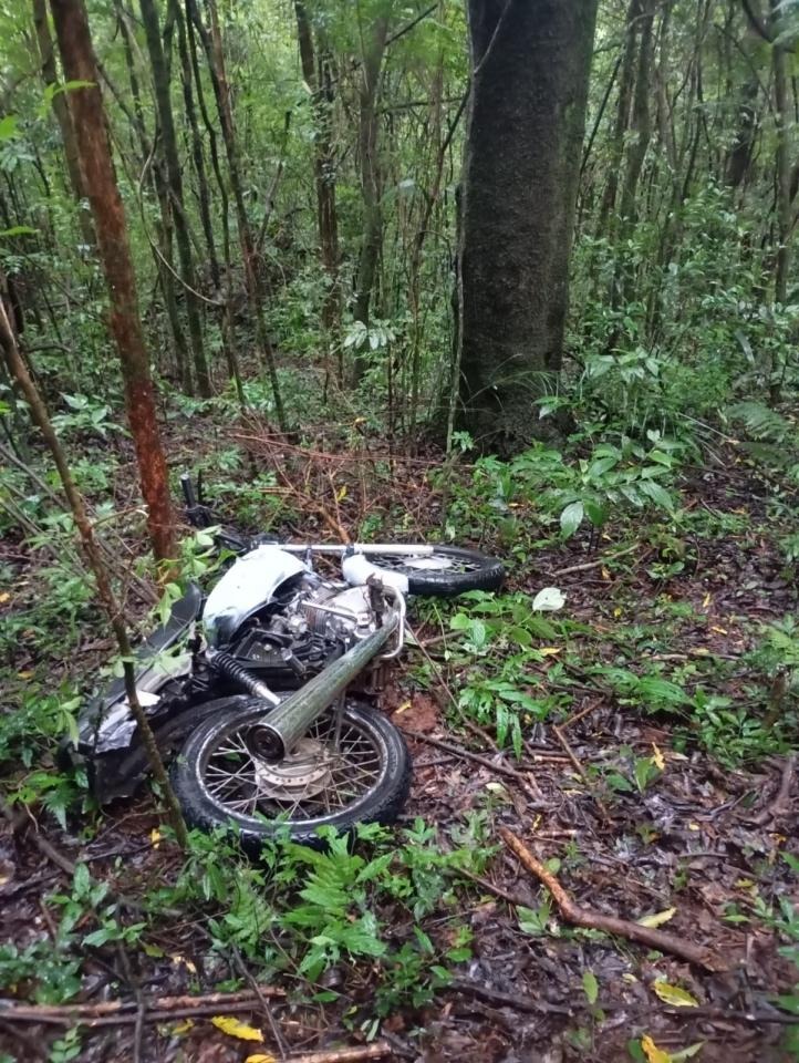 A ação teve início após a guarnição receber informações anônimas indicando que uma motocicleta estaria escondida em uma área de mata na região. Diante da denúncia, os policiais se deslocaram até o local e realizaram buscas, localizando o veículo a aproximadamente 100 metros mata adentro, em um ponto de difícil acesso.