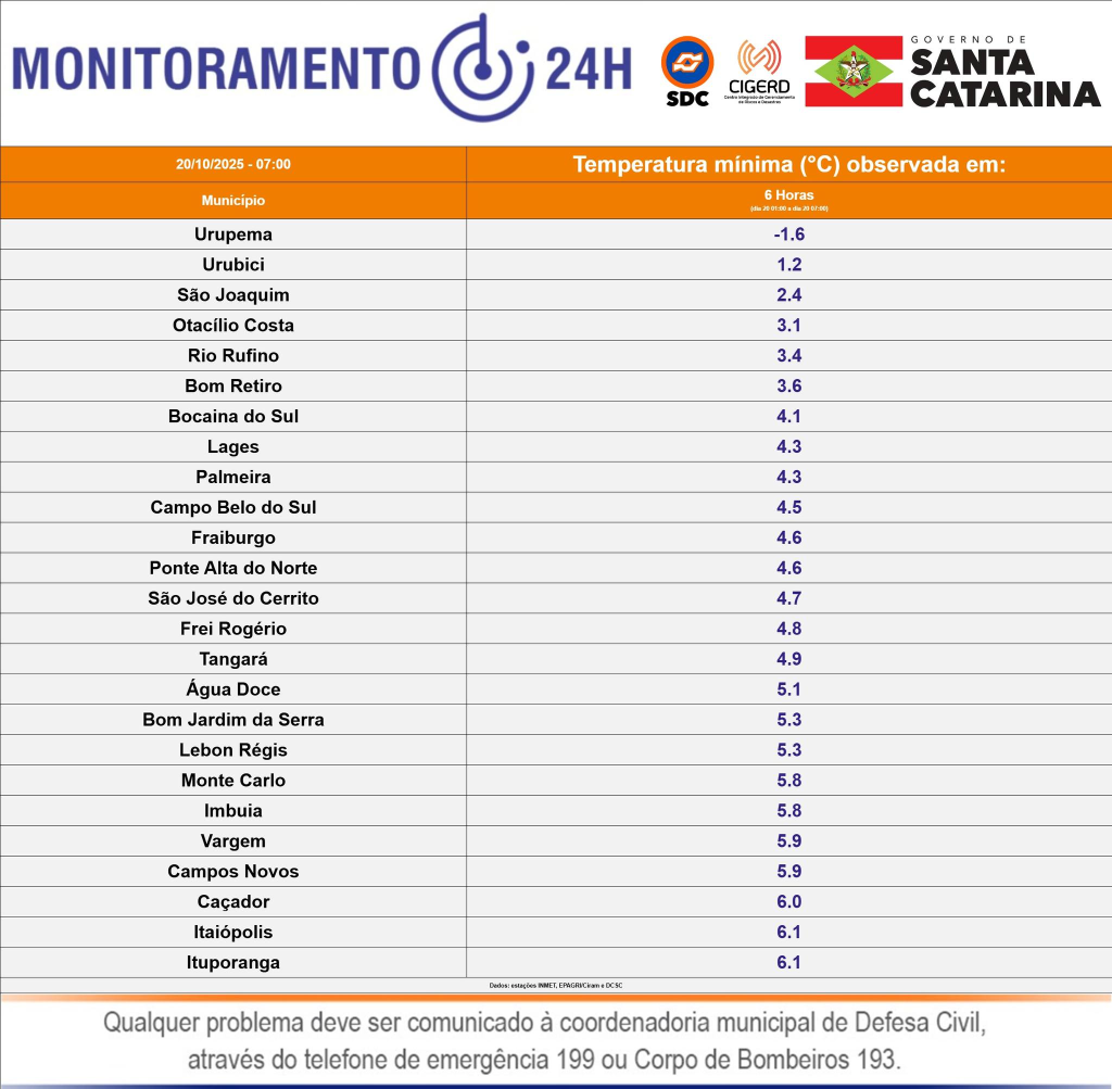 A segunda-feira, dia 20, amanheceu com muito frio em Santa Catarina. Em Urupema, cidade da Serra com título de Capital Nacional do Frio, a mínima chegou a -1,58 °C, às 6h. Na vizinha Urubici, os termômetros chegaram a 1,21°C. Em Lages, maior cidade da região, o amanhecer marcou 4,25 °C.