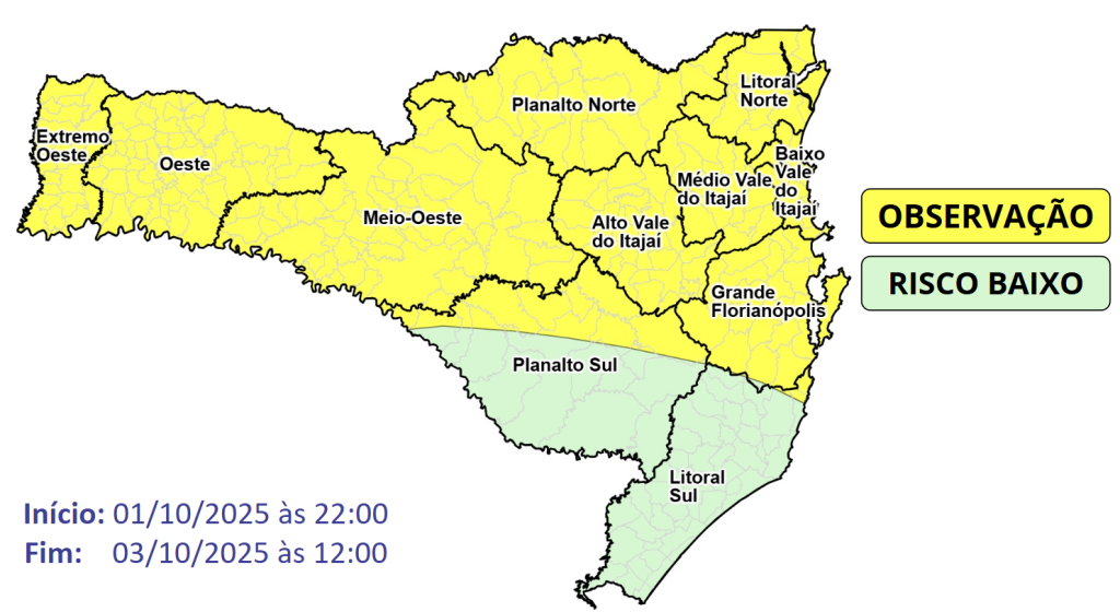 A instabilidade com presença de chuva forte ainda não foram embora de Santa Catarina. Entre a noite desta quarta-feira (01) e a manhã de sexta-feira (03), há condições para chuvas persistentes e por vezes intensas em Santa Catarina, especialmente entre o Grande Oeste, todo o Vale do Itajaí e norte catarinense.
