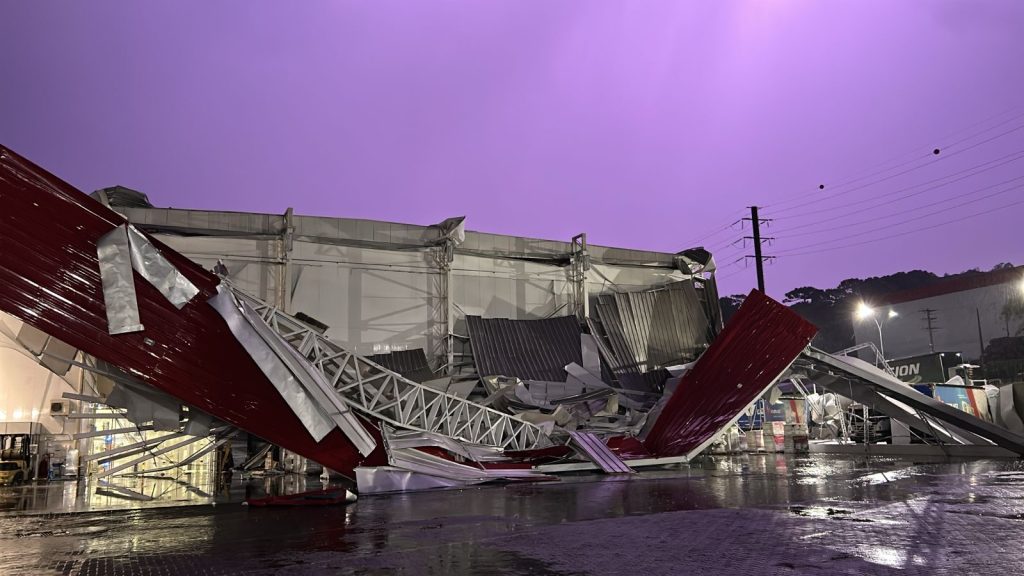 Entre os locais mais atingidos está a empresa Videplast, que teve parte do telhado arrancado e trechos de paredes derrubados. Imagens que circulam nas redes sociais — e que integram esta reportagem — mostram o cenário de danos estruturais, com materiais retorcidos e setores da fábrica expostos após a passagem do vendaval.