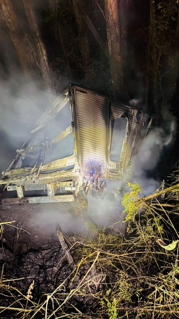 Após a saída de pista, o veículo acabou pegando fogo. Quando a guarnição chegou ao local, a caminhonete já havia sido totalmente consumida pelas chamas, restando apenas o trabalho de rescaldo. Para o procedimento, foram utilizados cerca de 300 litros de água.