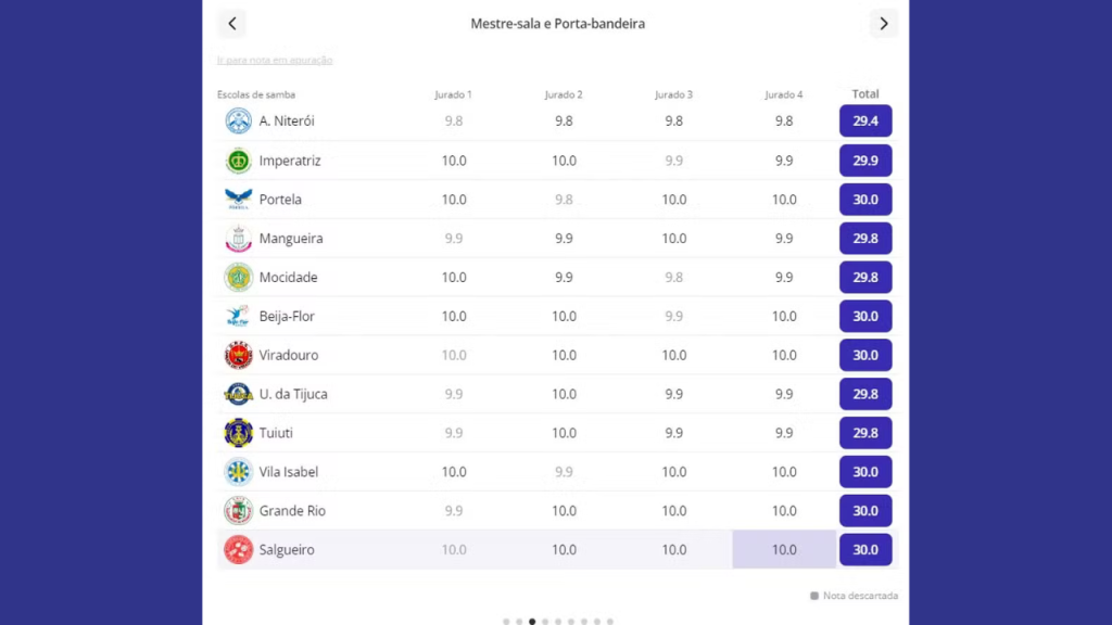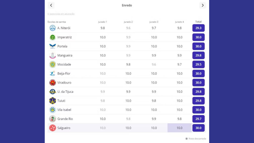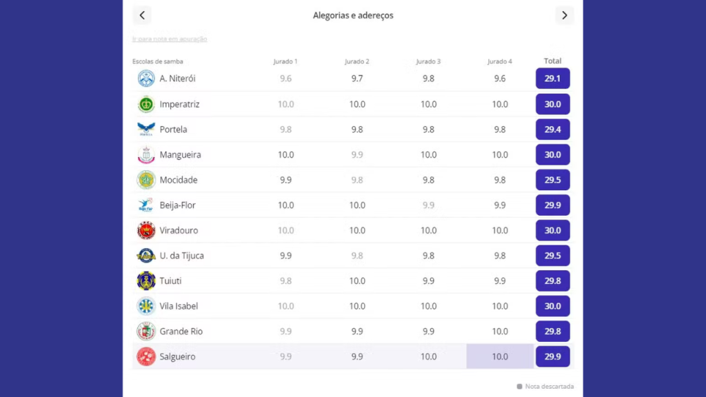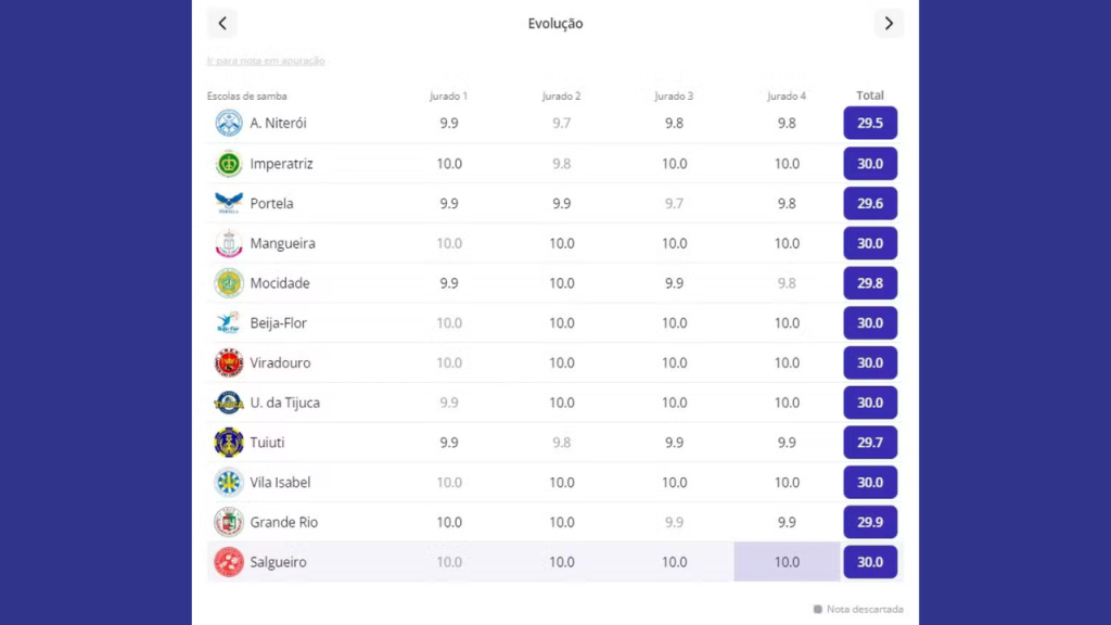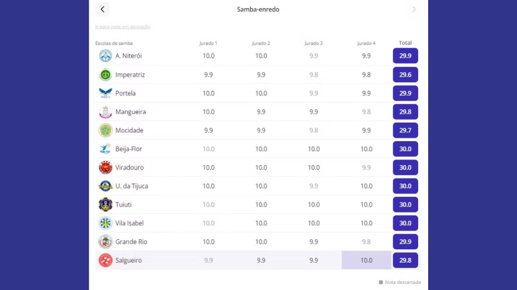 • As duas únicas notas 9.9 que a escola recebeu (uma em Evolução e outra em Samba-Enredo) foram descartadas, conforme prevê o regulamento da Liesa, que elimina a menor nota de cada quesito.